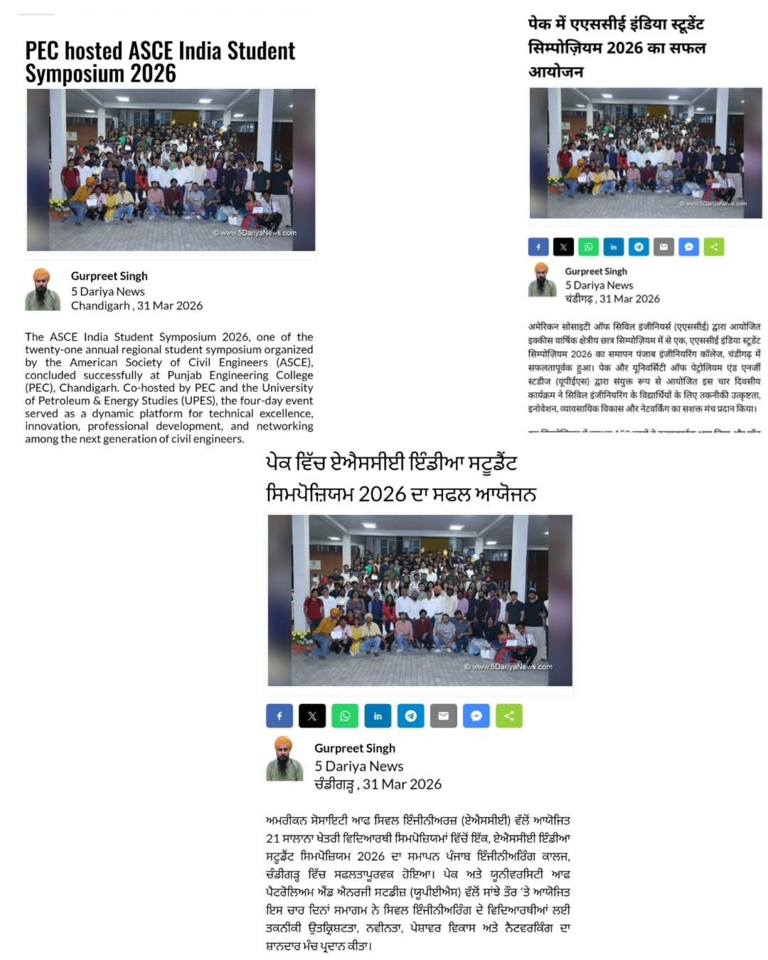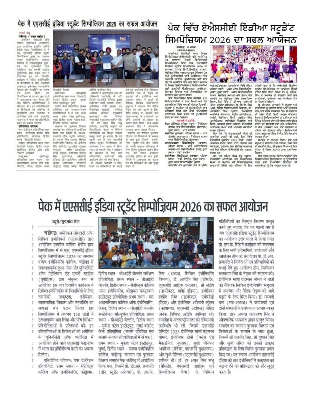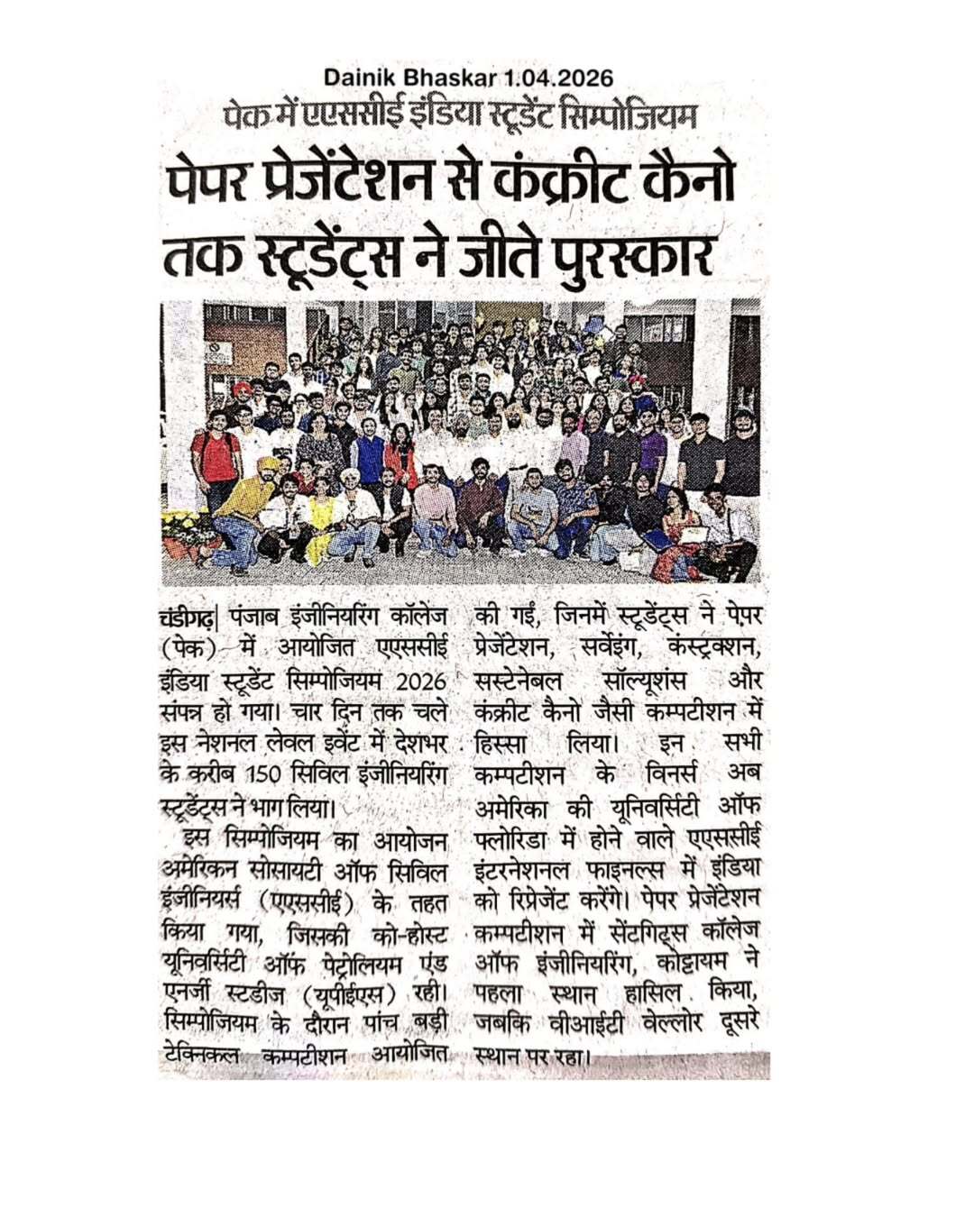 Punjab Engineering College (Deemed to be University), Chandigarh, continues to lead in technical excellence and academic competition. PEC recently served as the host for the ASCE India Student Symposium 2026, a prestigious four-day national event organized in collaboration with the American Society of Civil Engineers and UPES. The symposium brought together over 150 civil engineering students from across India, featuring intense competitions in paper presentations, surveying,and the iconic "Concrete Canoe" challenge. Winners from this event will now advance to represent India at the ASCE International Finals at the University of Florida, USA.