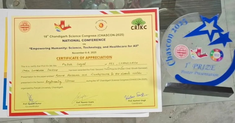 Big cheers to Palak Goyal, 1st year Electrical Engineering student, for achieving the 3rd prize 🥉 in the Poster Presentation at the 18th Chandigarh Science Congress (CHASCON-2025) in the Engineering Section, held at Panjab University, Chandigarh. ⚡👏 Proud moment for PEC! 🌟