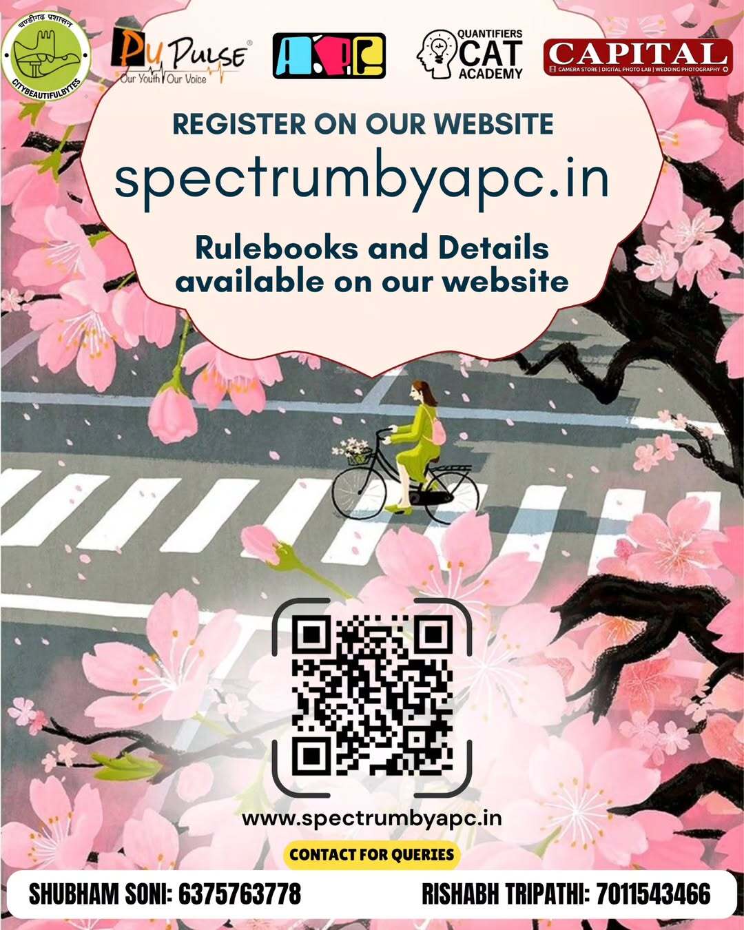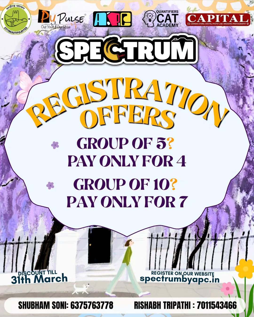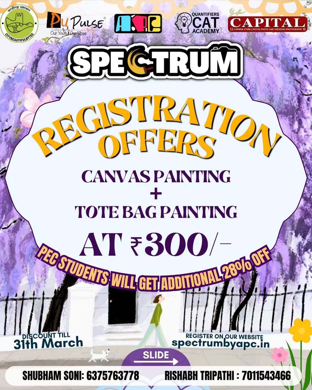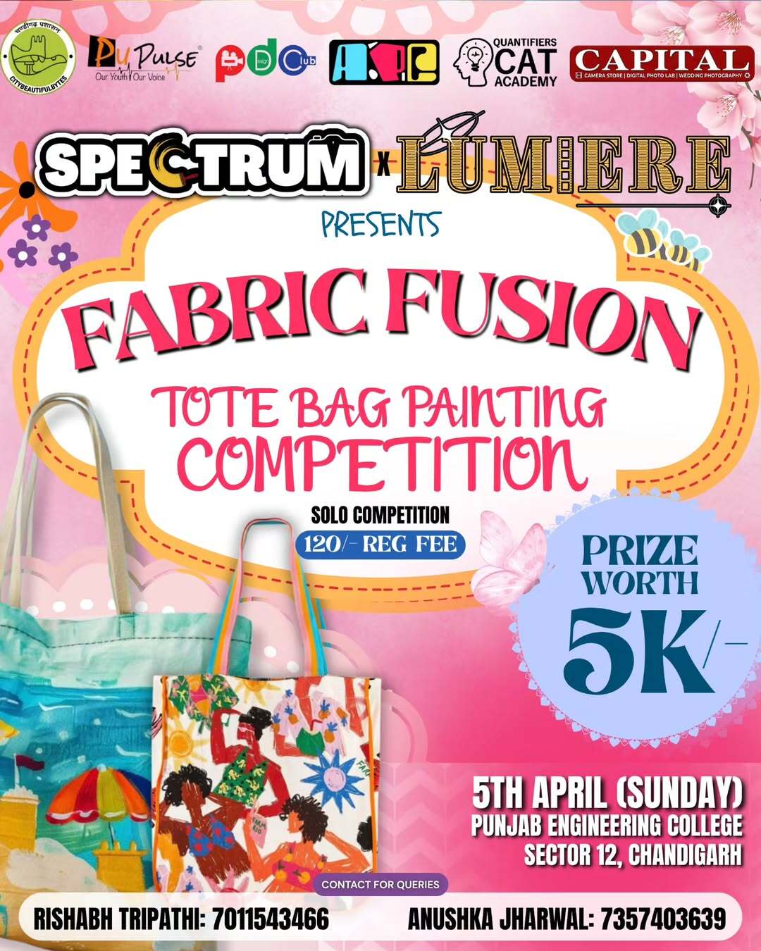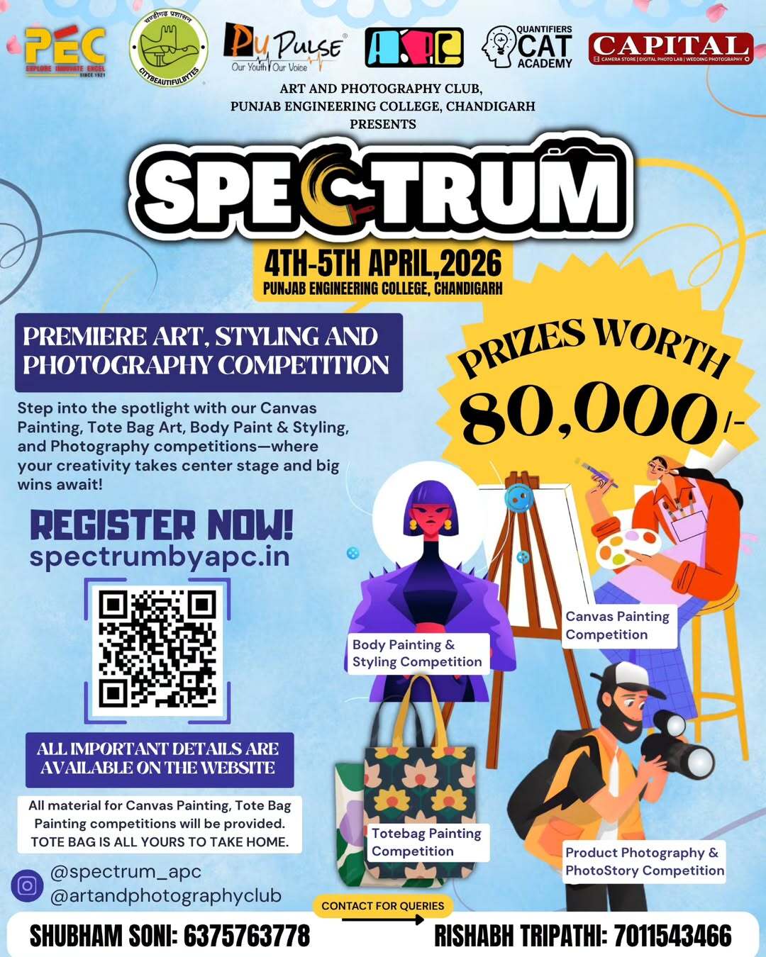 ✨ SPECTRUM 2026 ✨ PEC Chandigarh’s Annual Art & Photography Festival is here! 🎨📸 📅 4th–5th April 2026 📍 Punjab Engineering College, Chandigarh Step into a world of creativity, colors, and storytelling as Spectrum brings together artists, photographers, and visionaries for two unforgettable days. 🔥 Events Line-up: 🎨 Canvas Conclave – Turn imagination into masterpieces 👜 Fabric Fusion (Tote Bag Painting) – Design your own wearable art 🖌 Painted Personas – Where art meets identity and expression 📦 Brand in Frame – Showcase products through creative photography 📖 Narrative Lens – Tell powerful stories through your lens 🏆 ₹80,000 Prize Pool up for grabs! Whether you’re an artist, photographer, or creative enthusiast, this is your chance to showcase your talent, express your vision, and compete with the best. 🌸 Create. Capture. Compete. Join us at Spectrum 2026 and be part of PEC’s most vibrant celebration of art and creativity! ✨🔥